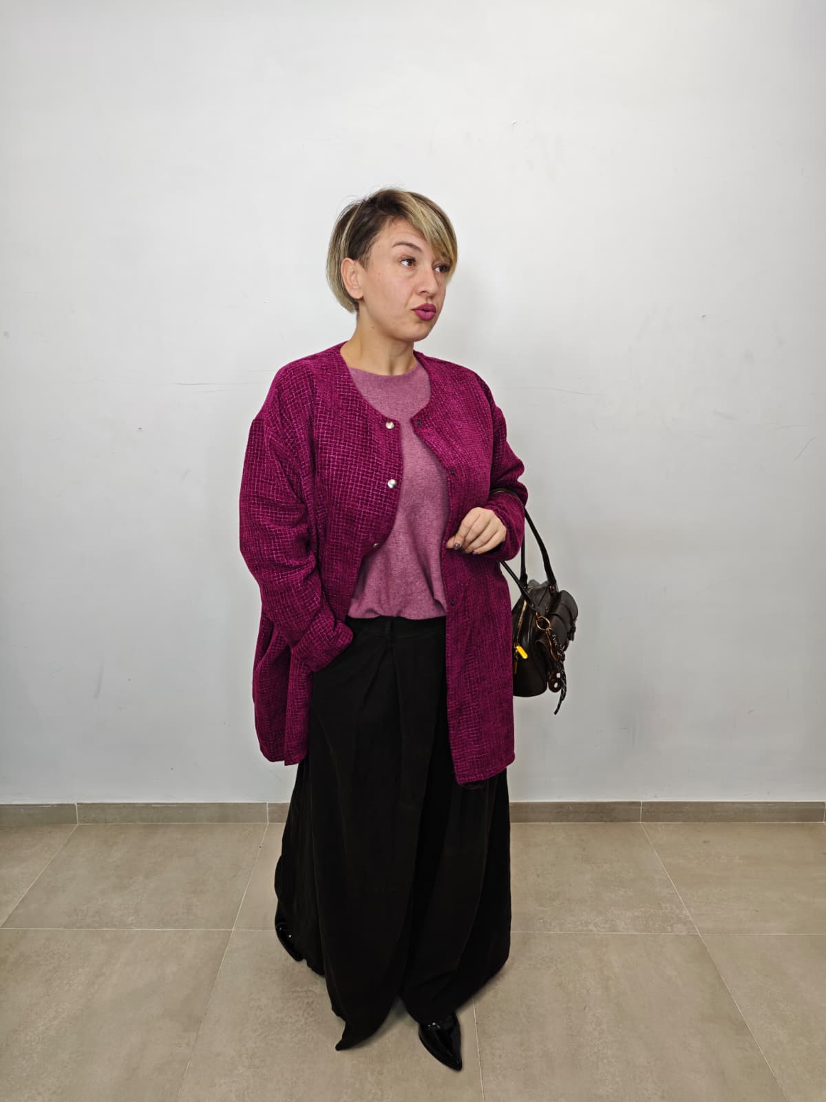 Scopri la GIACCA NINA, il capo che abbraccia le tue curve con stile! Realizzata in pregiato tessuto filato vintage, questa giacca unica si adatta perfettamente dalle taglie 48 alla 54, regalandoti una vestibilità impeccabile. I bottoni avanti ti permettono di indossarla come preferisci, mentre le comode tasche laterali sono perfette per tenere a portata di mano quello che ti serve. Un mix irresistibile di comfort e eleganza retrò che farà brillare la tua personalità!