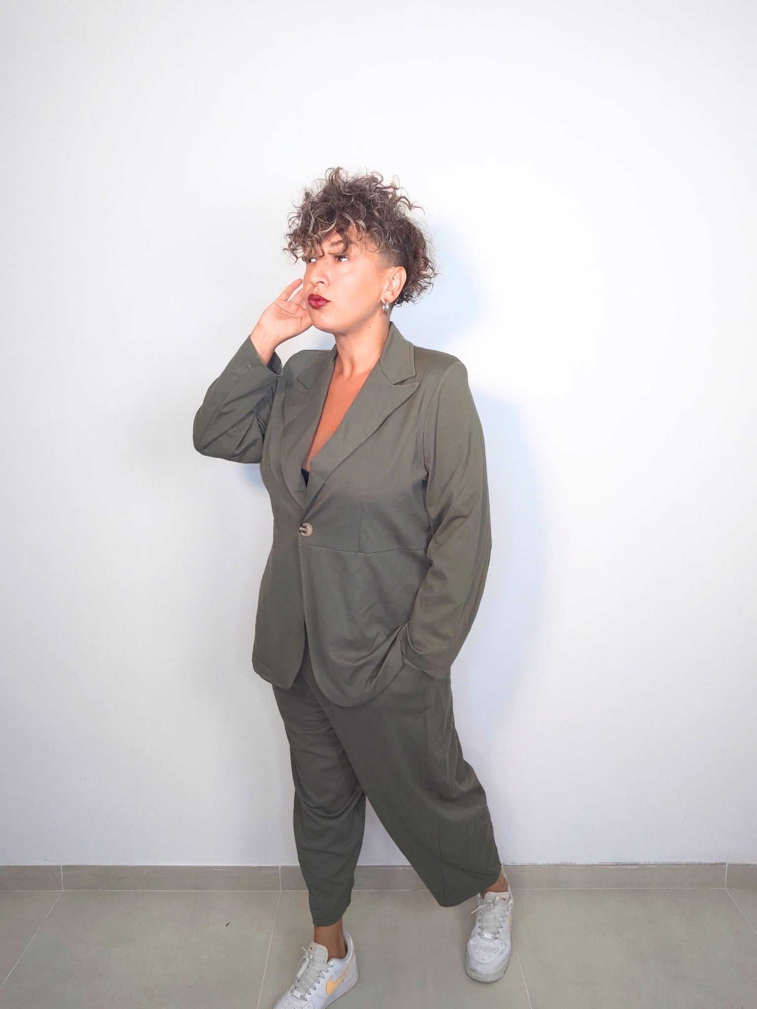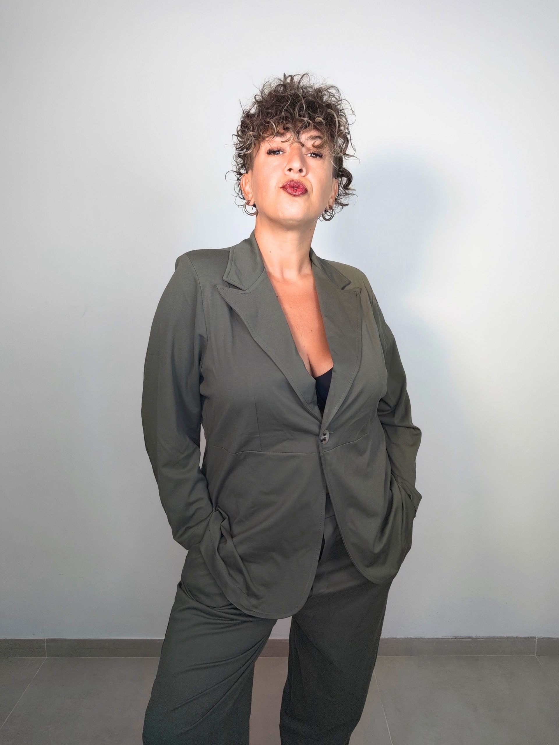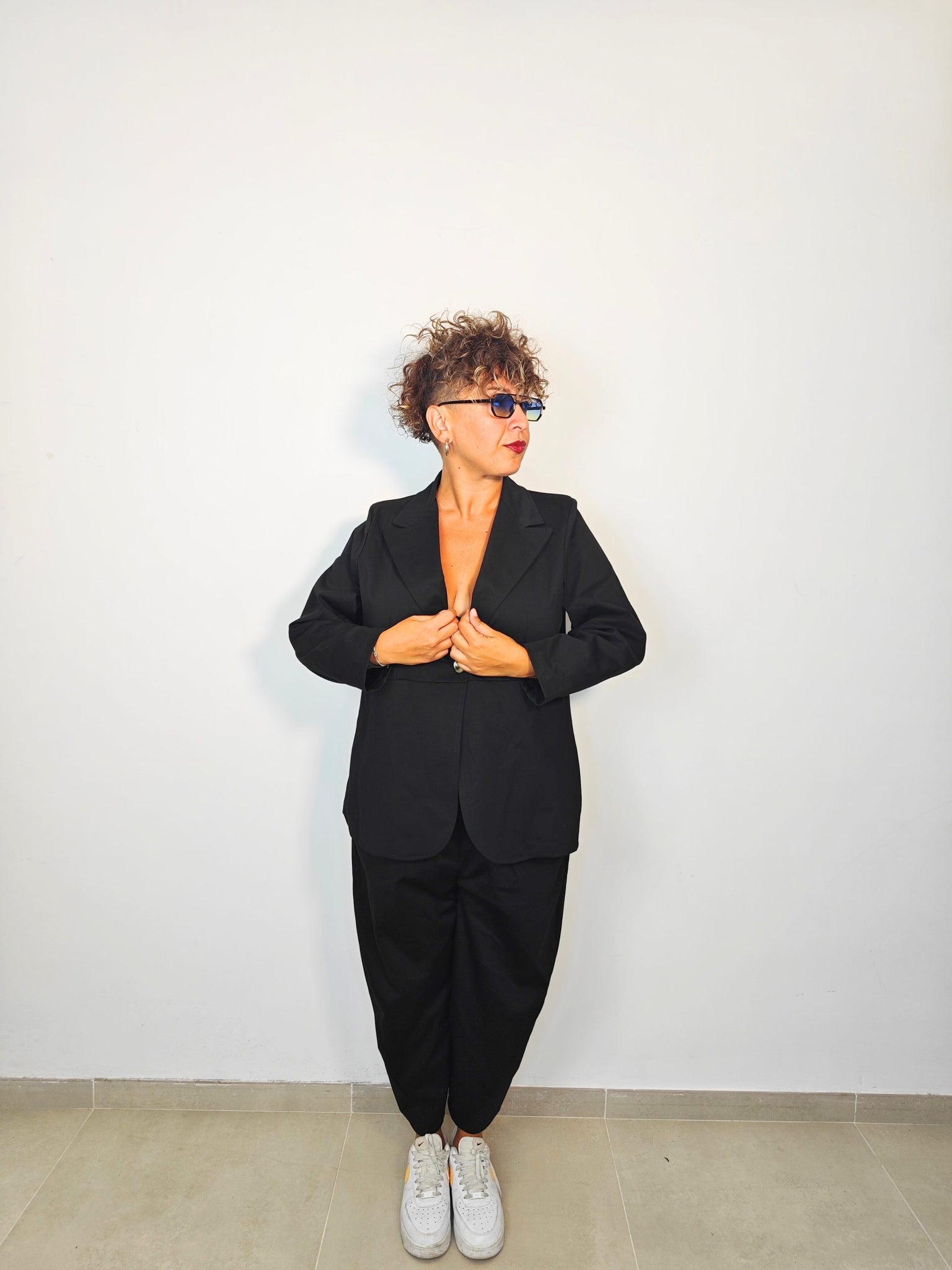 Giacca con spalline imbottite, scollatura profonda a v, bottone centrale, fit avvitato