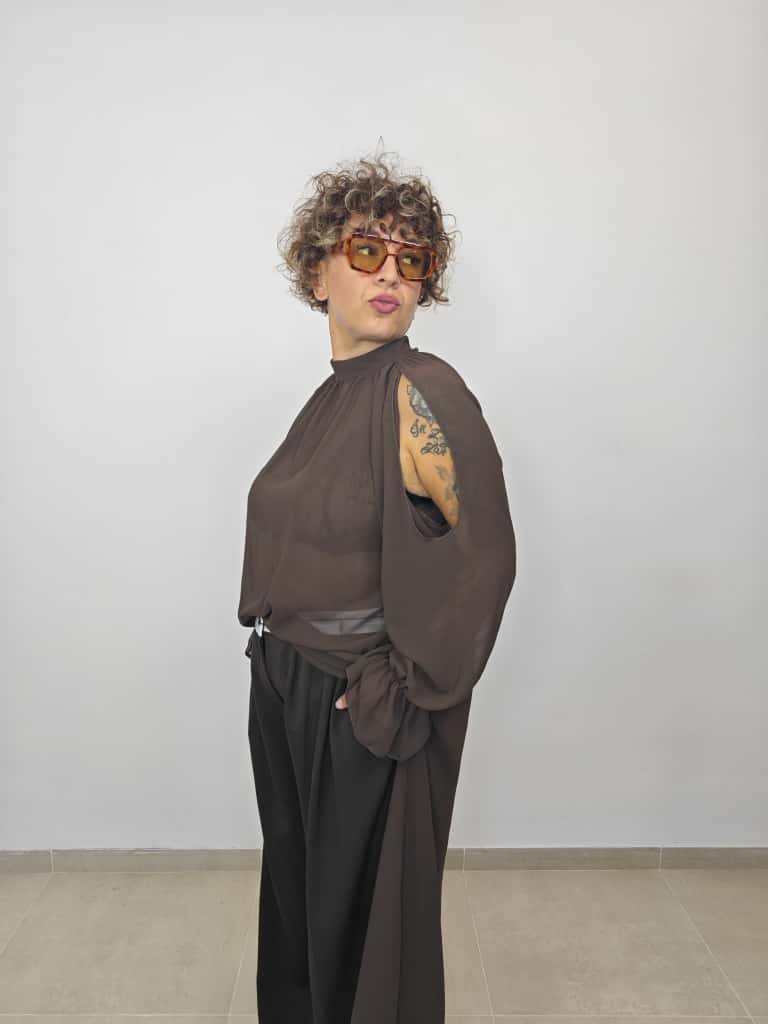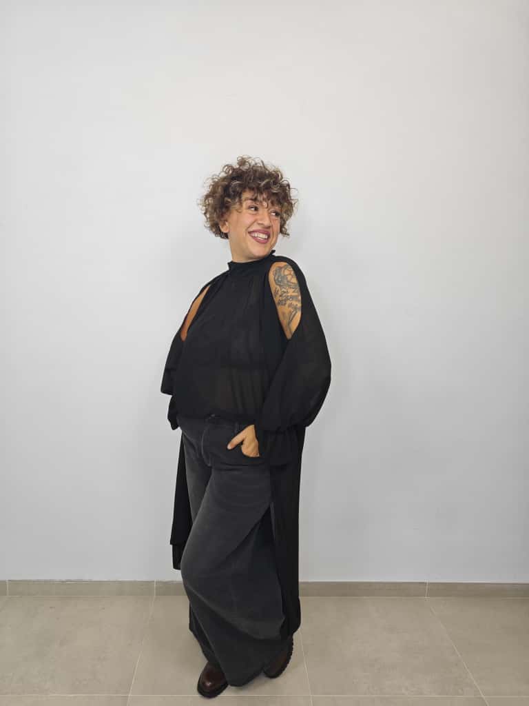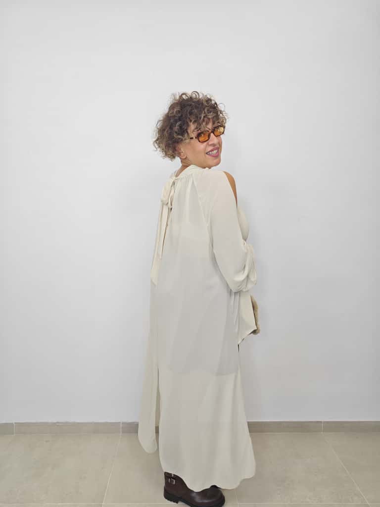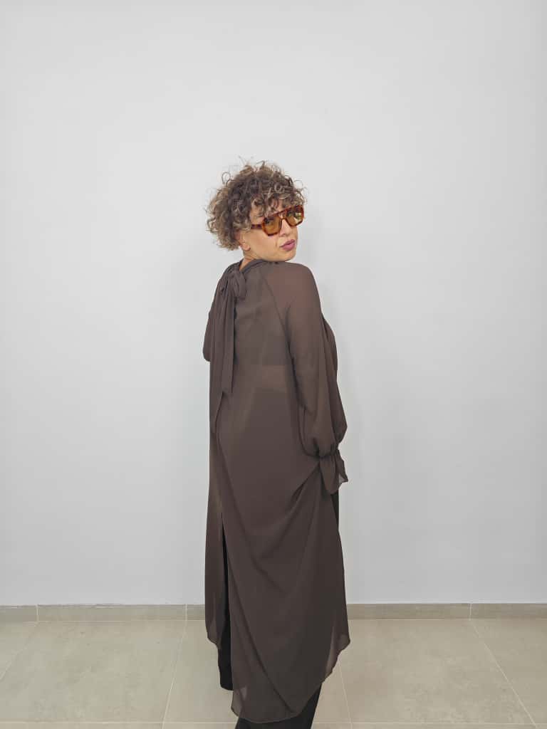 Chiusura al collo con nastro per fare il fiocco, buchi sulle spalle e metà braccio, corta avanti lunga dietro