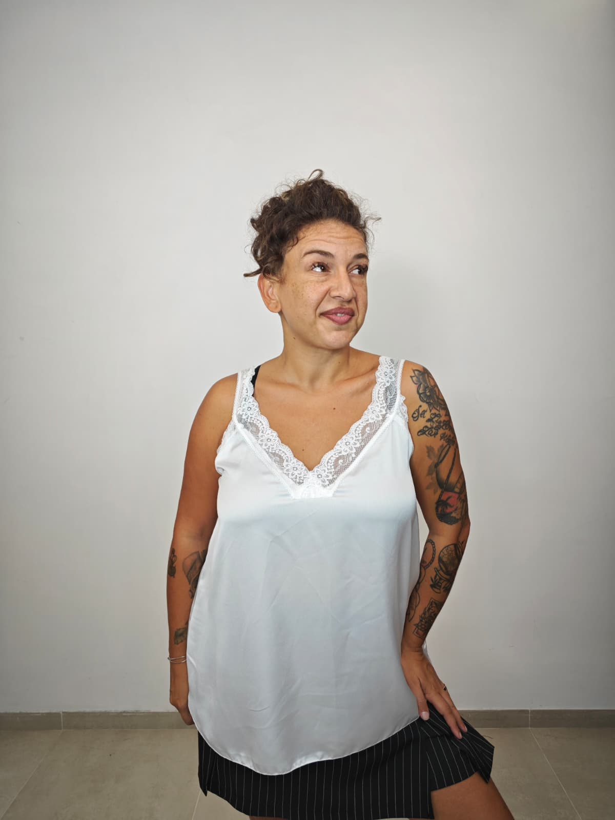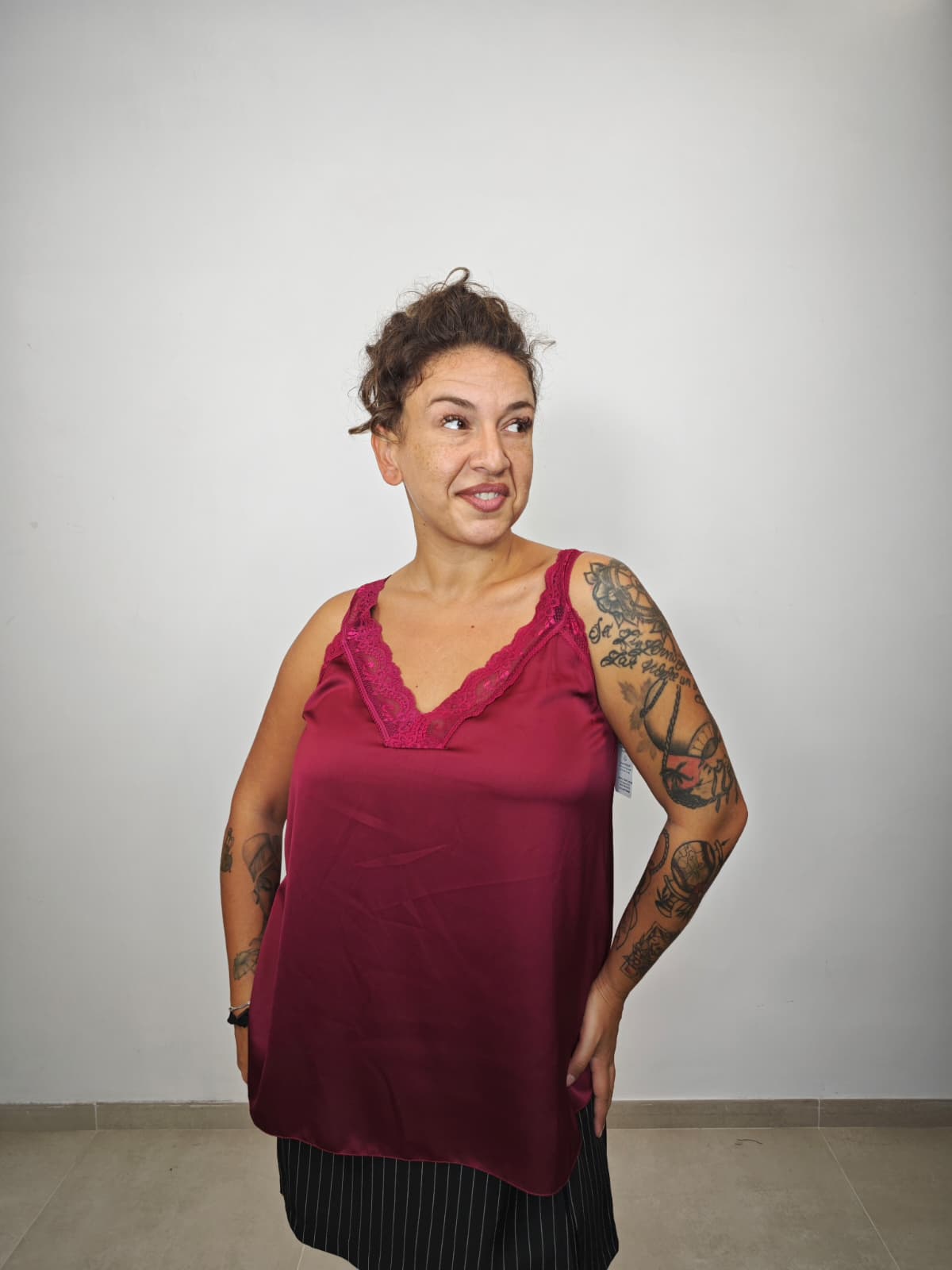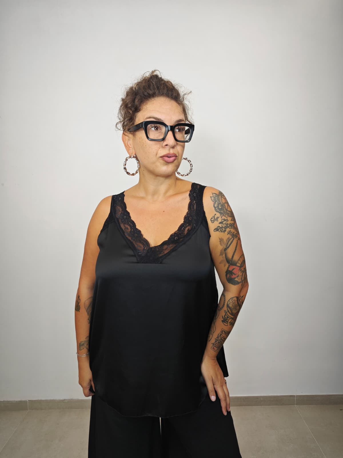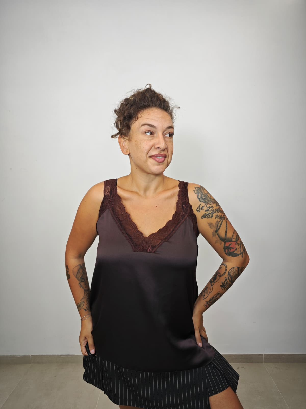 Pizzo su scollatura e bretelle, elastico sul retro, tessuto simil raso lucido