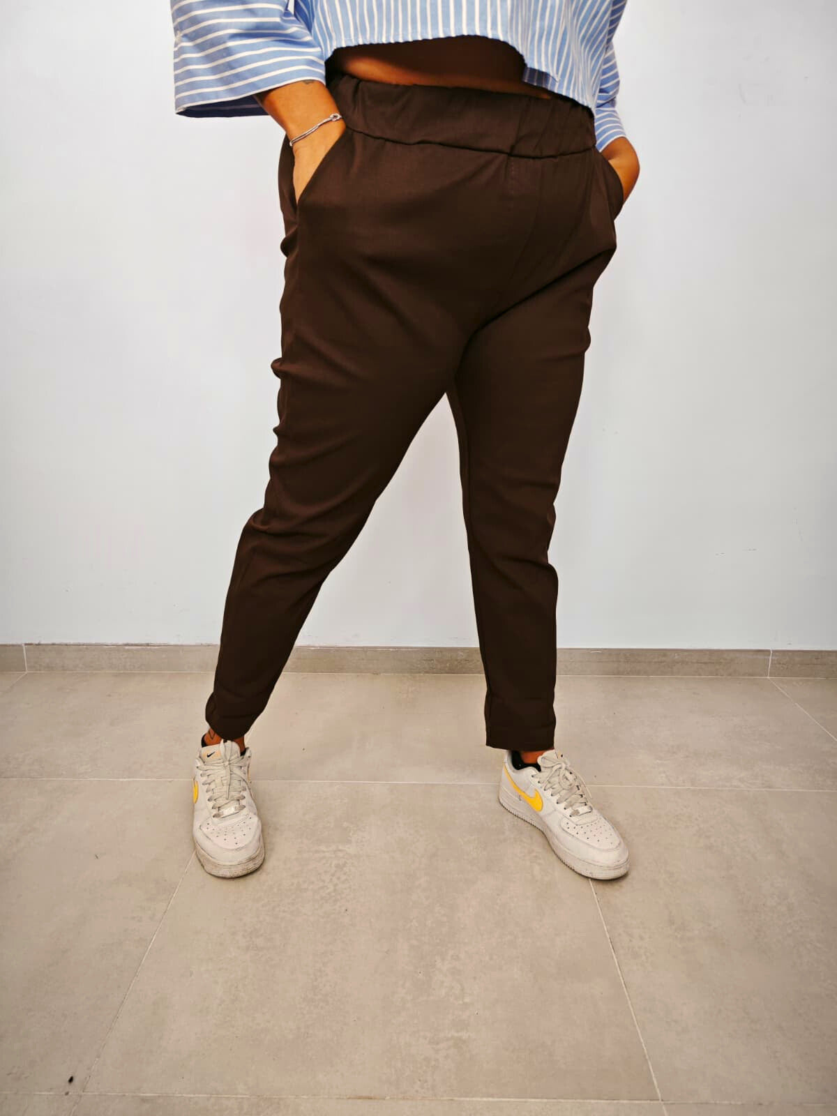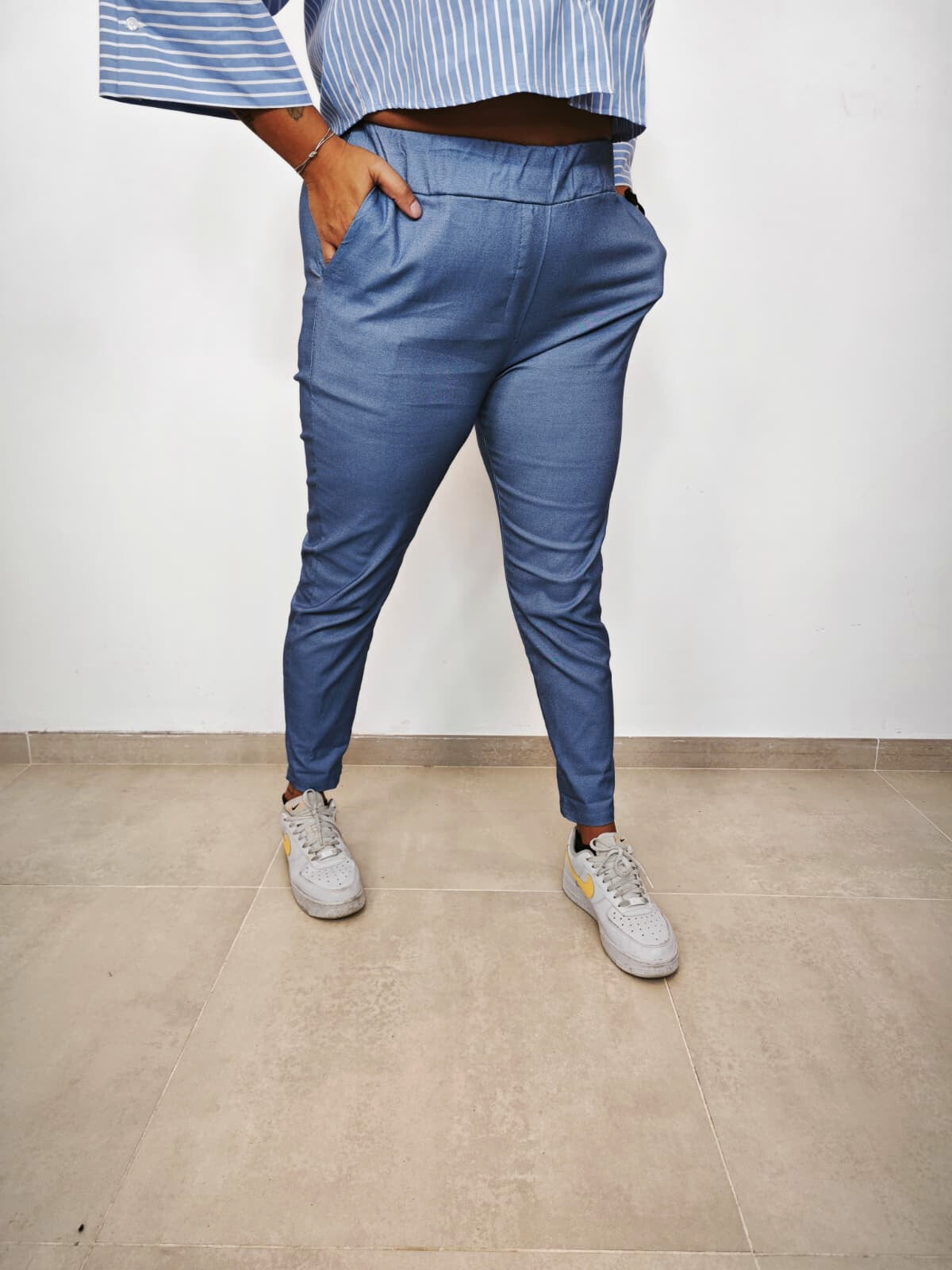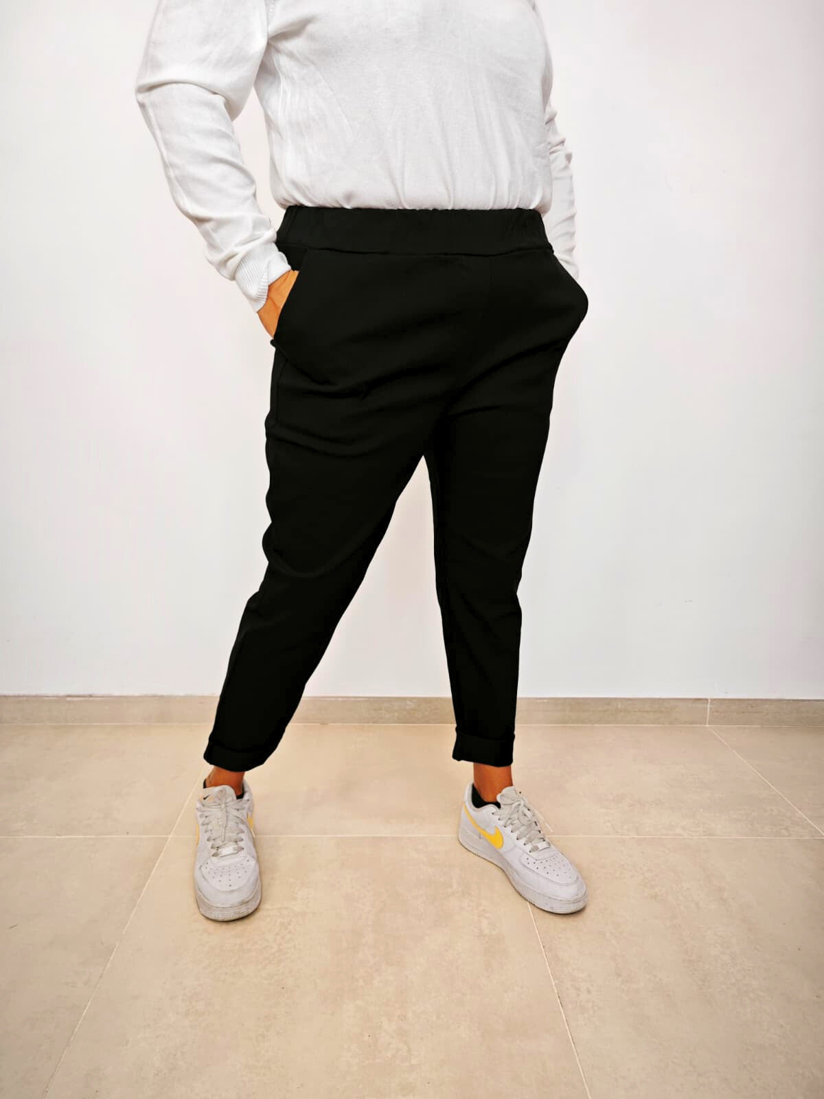 Pantalone con fit a sigaretta, tessuto elasticizzato, tasche laterali con elastico in vita.