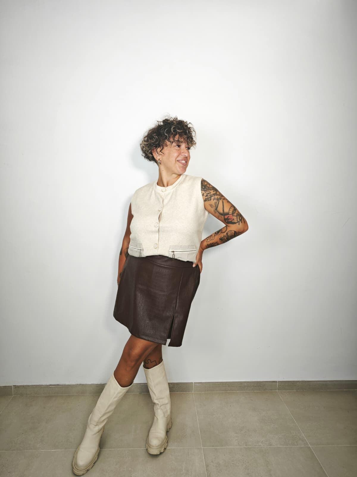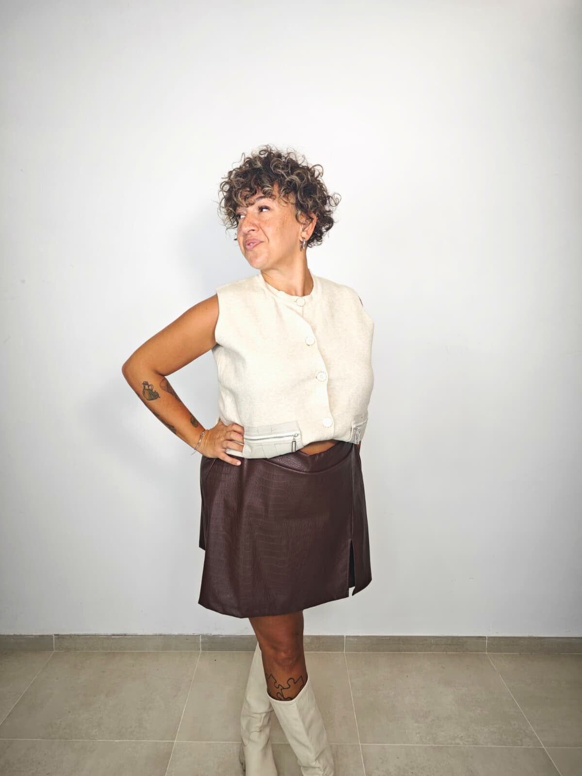 Elastico in vita sul retro, avanti gonna, dietro short, tessuto in ecopelle martellata