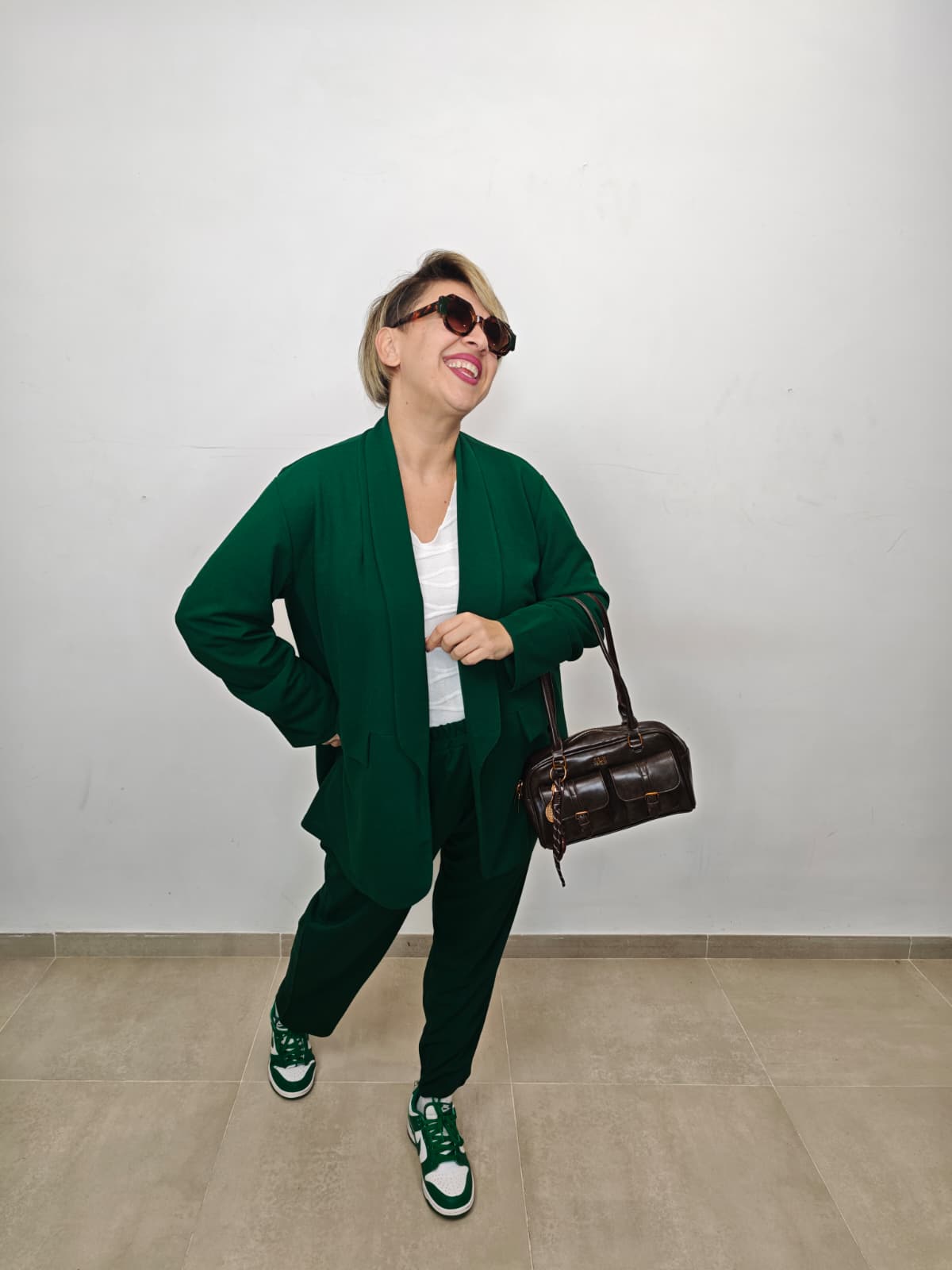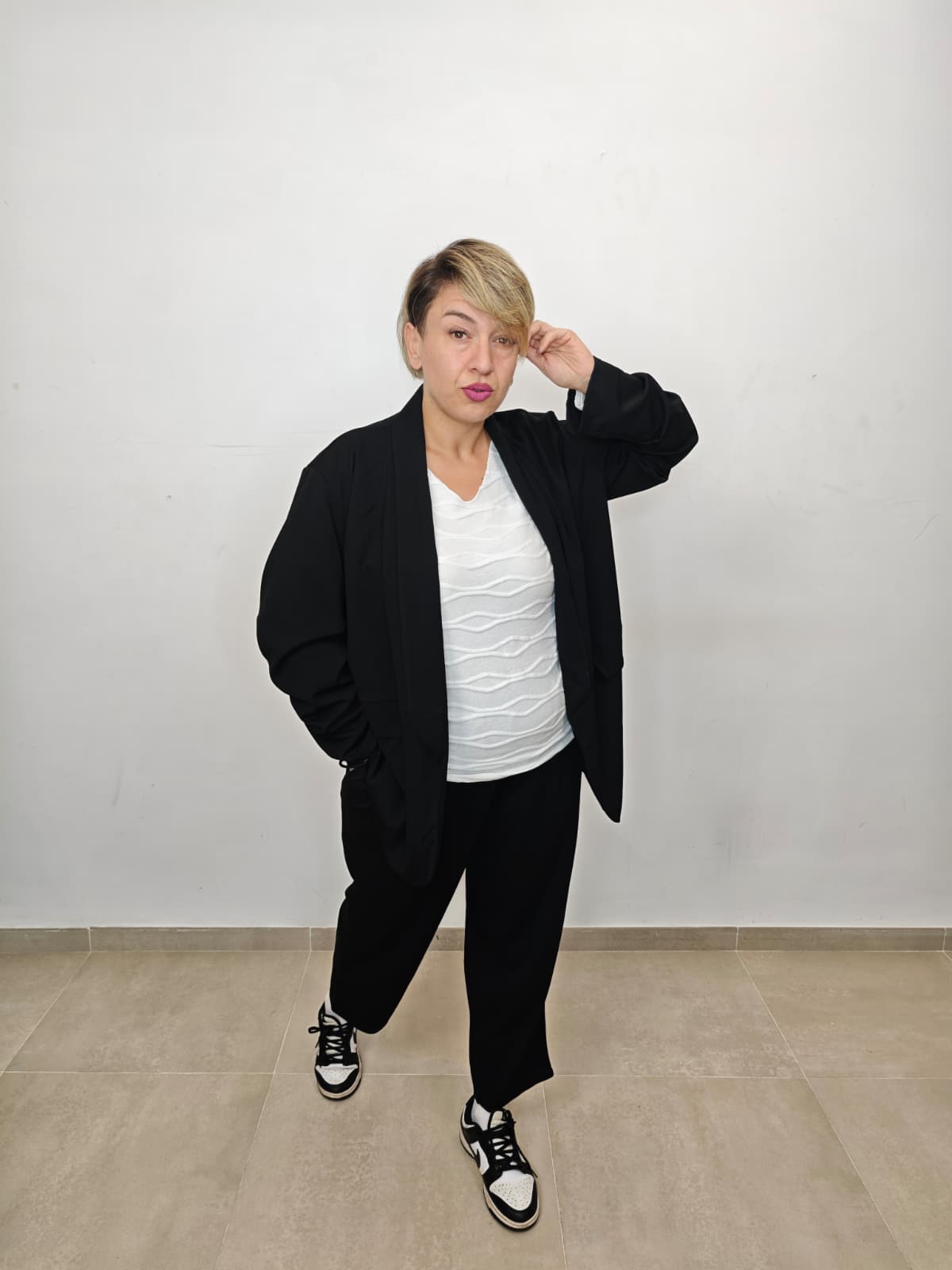 Eleganza senza compromessi con il nostro tailleur over! Blazer con maniche arricchiate che catturano lo sguardo, perfetto per aperitivi e occasioni speciali. Pantalone comodo con elastico in vita e tasche laterali pratiche. Tessuto sfoderato che garantisce libertà di movimento. Taglia unica, vestibilità 50-56: il fit che abbraccia tutte le forme con stile e personalità. Perché la moda curvy merita un tailleur che non scende a compromessi!