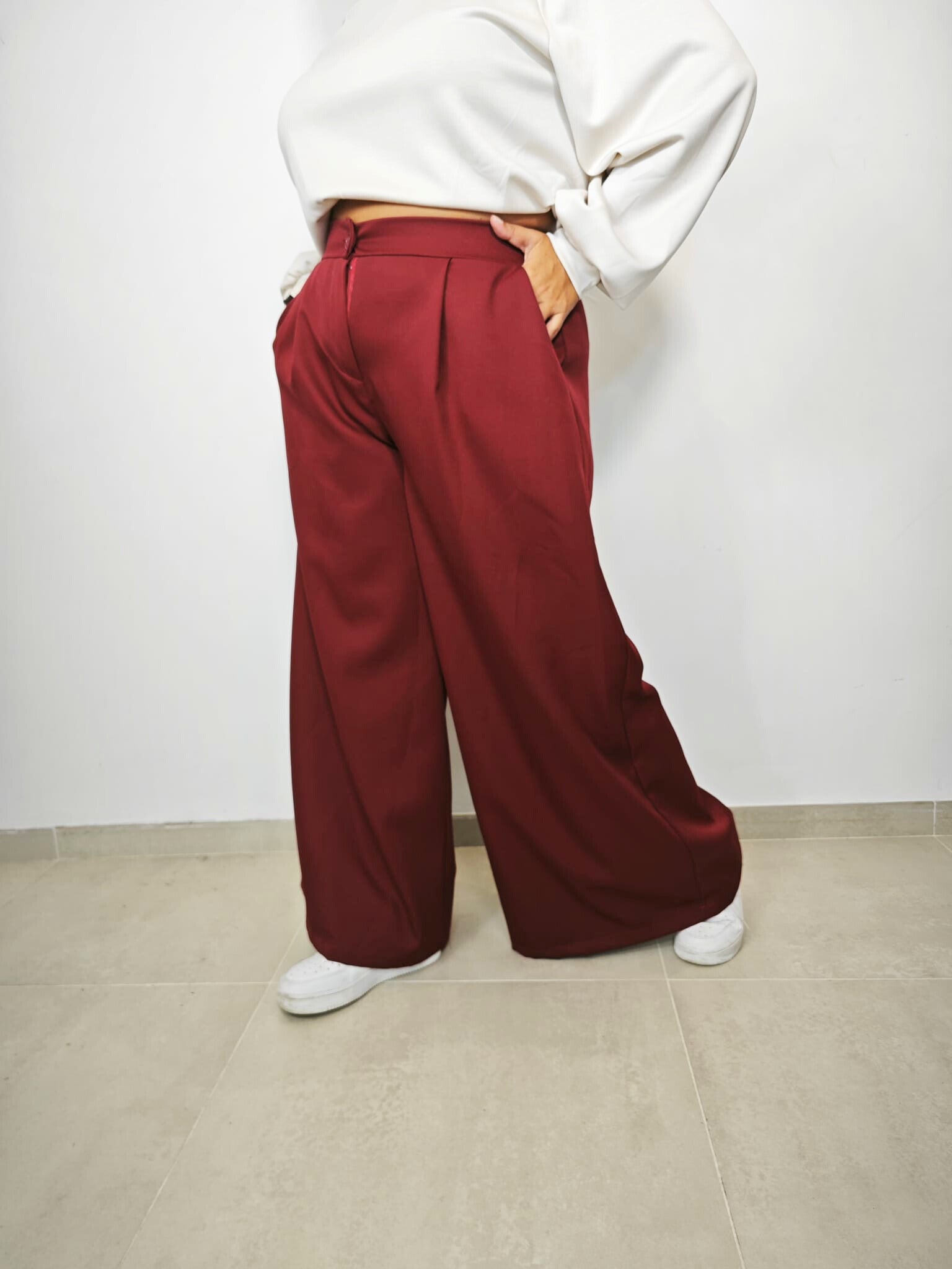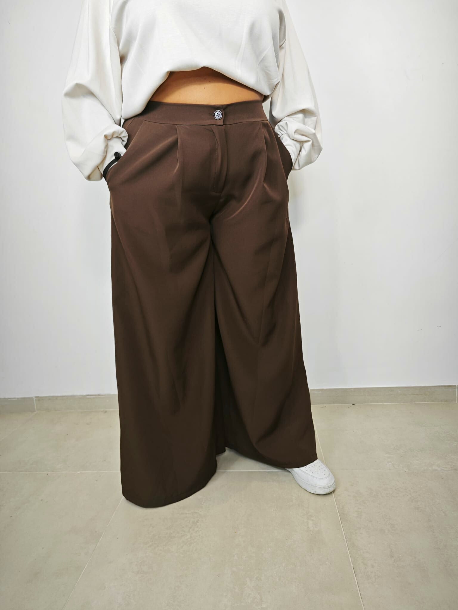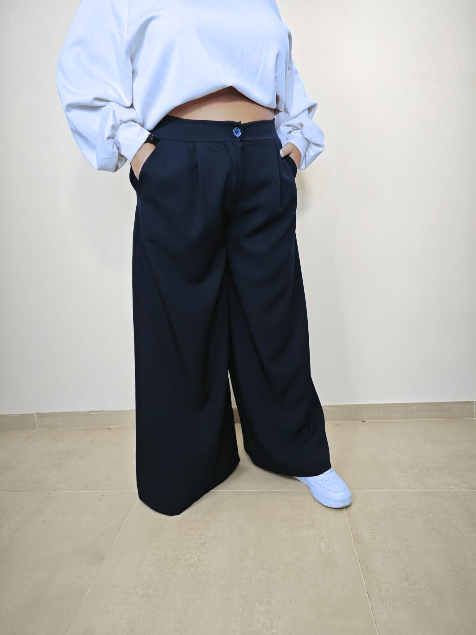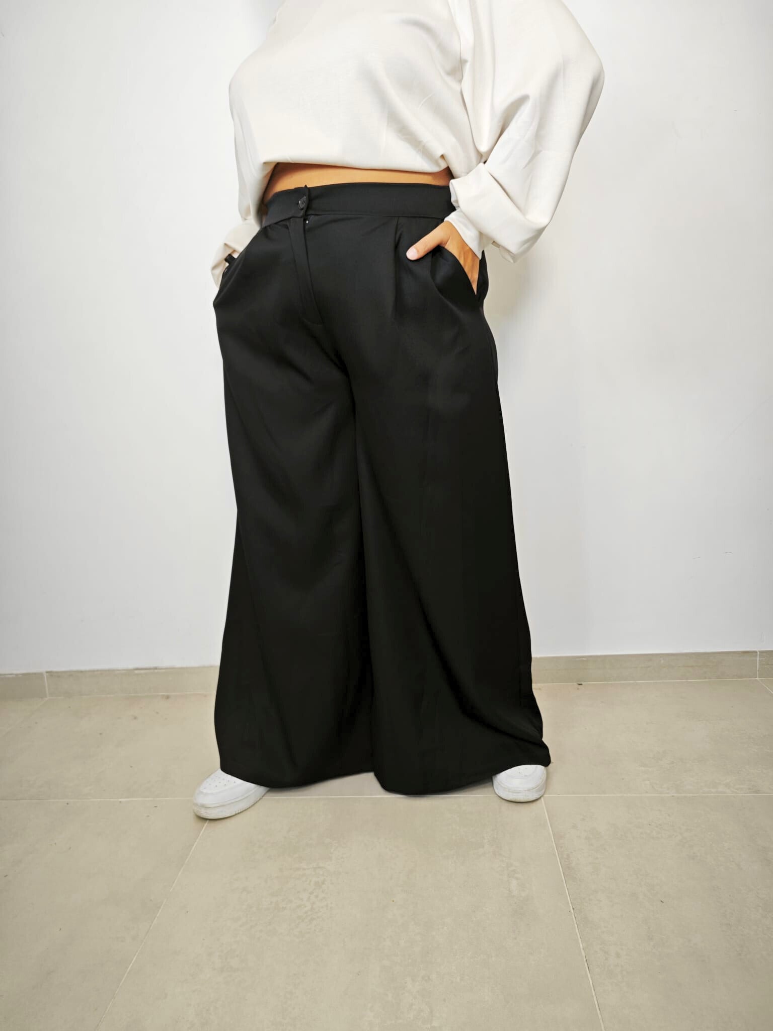 bottone con zip e tasche laterali, elastico sul retro, fit palazzo