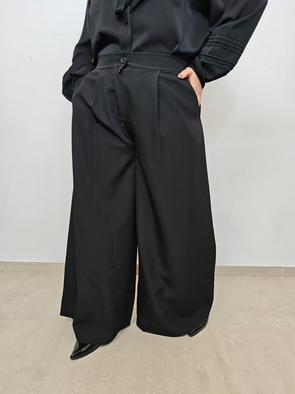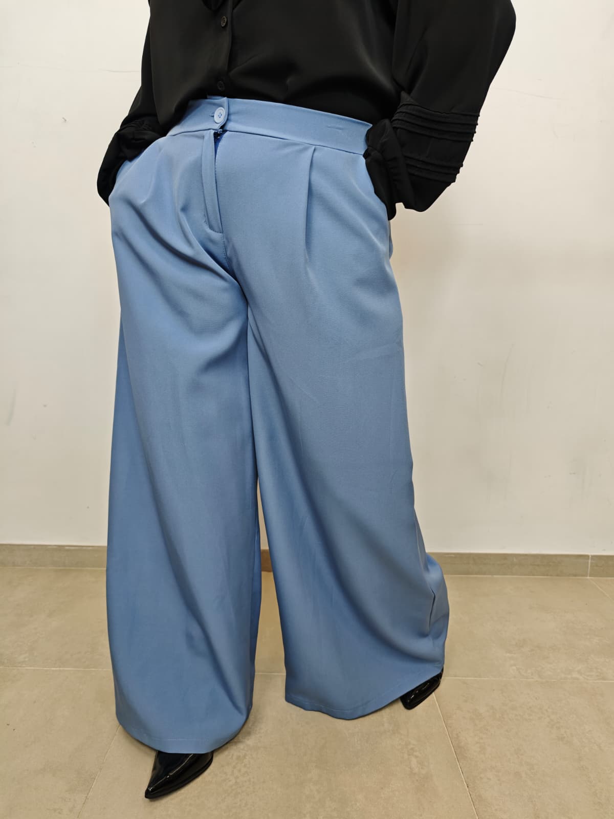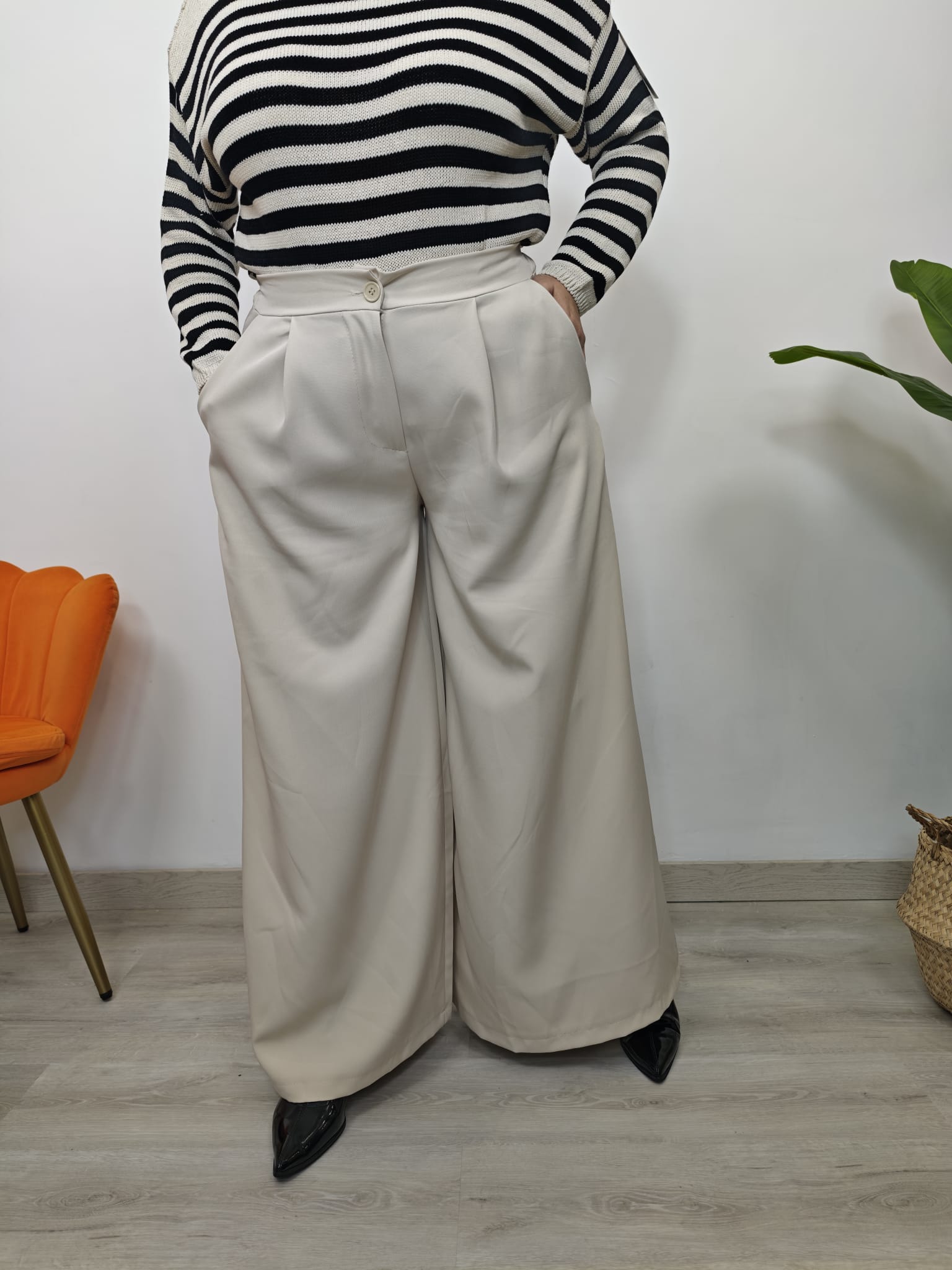 bottone con zip e tasche laterali, elastico sul retro, fit palazzo