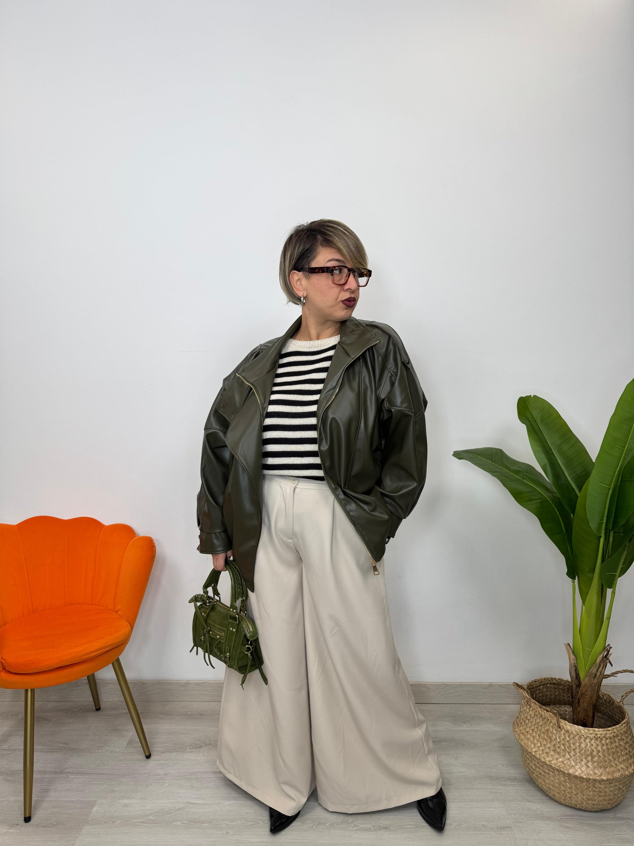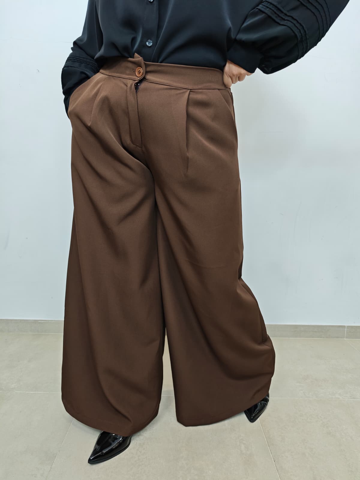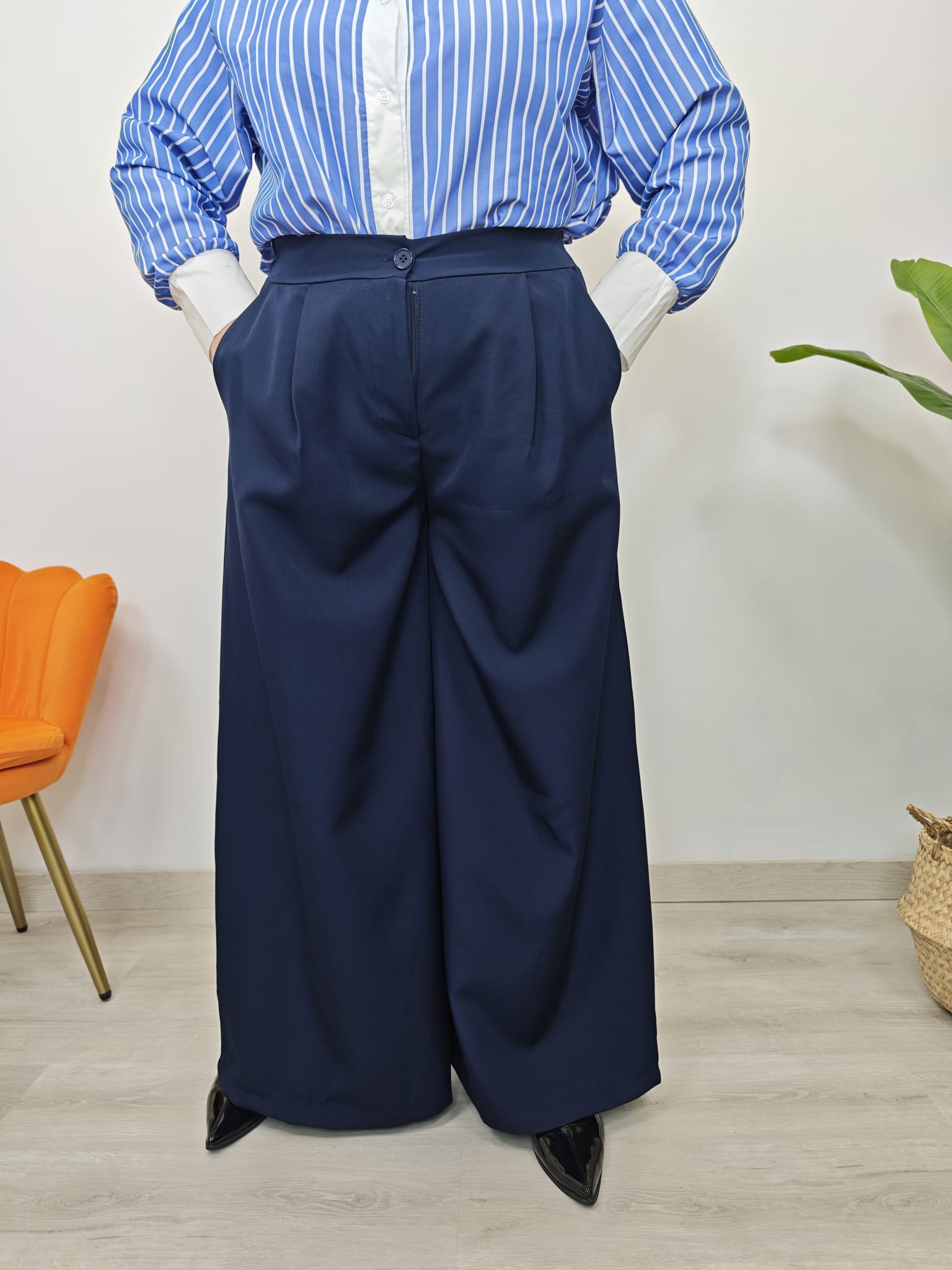 bottone con zip e tasche laterali, elastico sul retro, fit palazzo