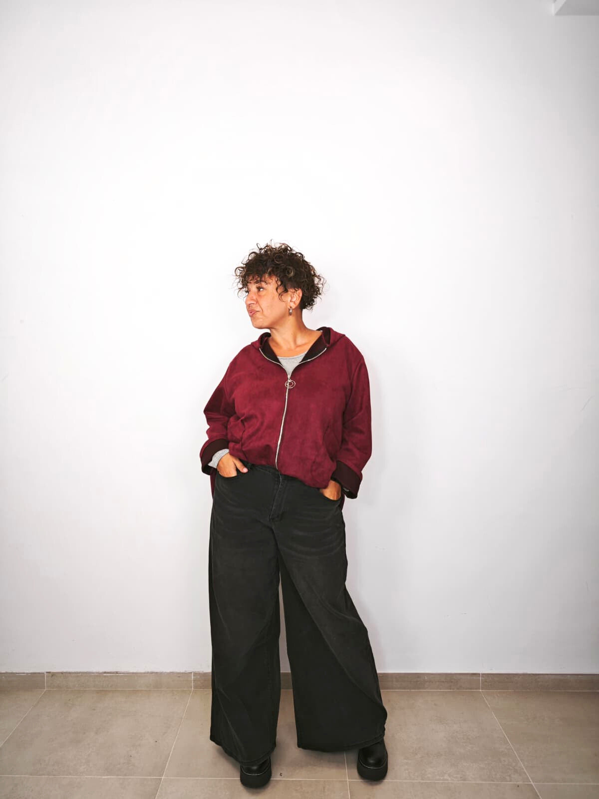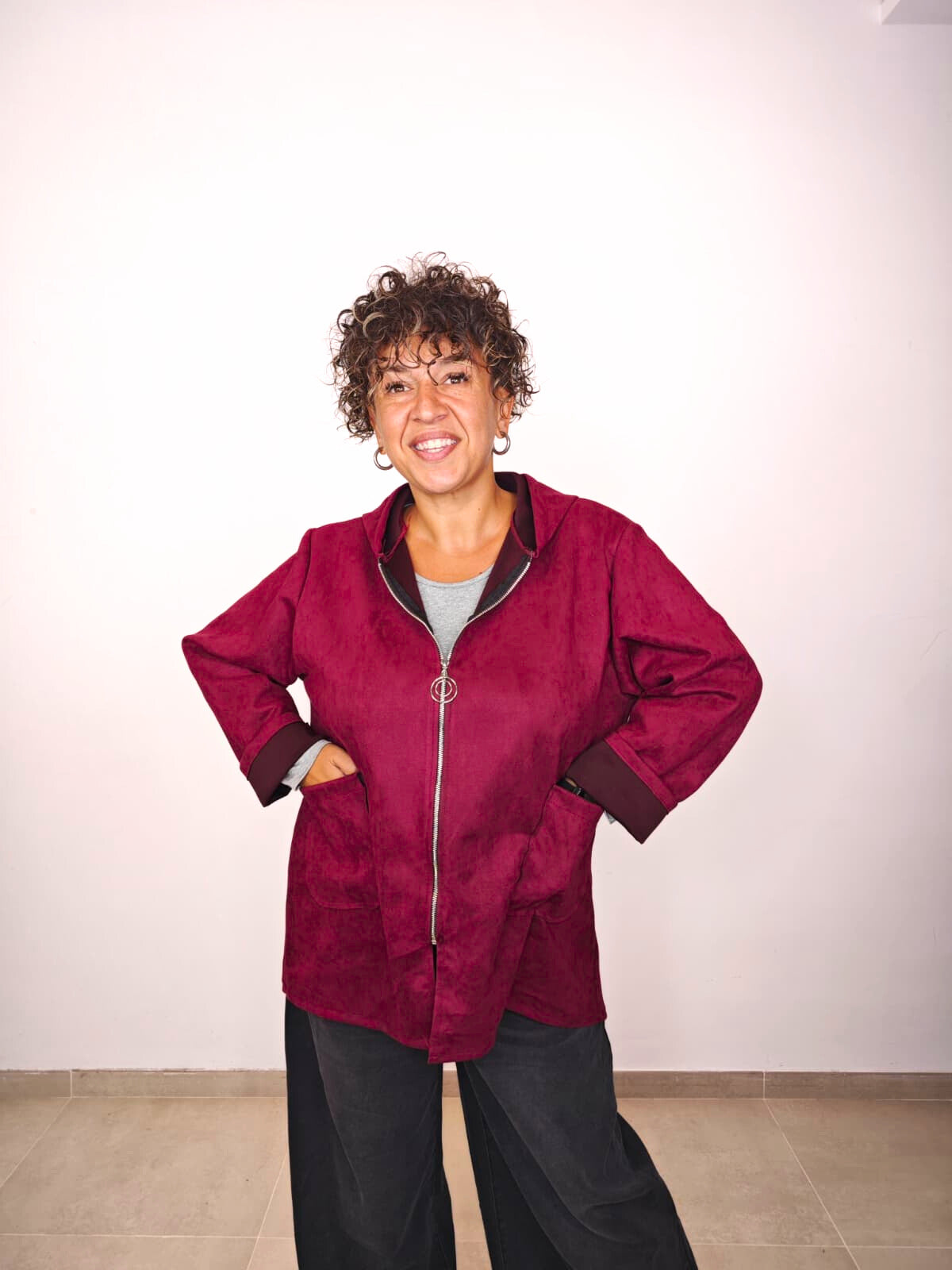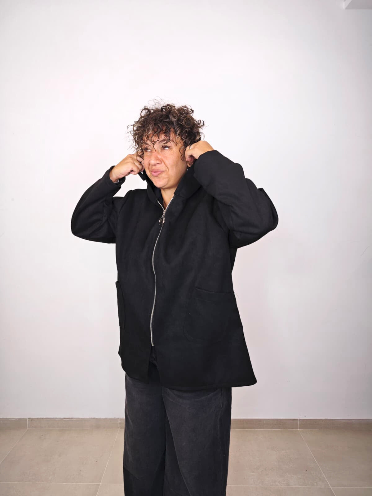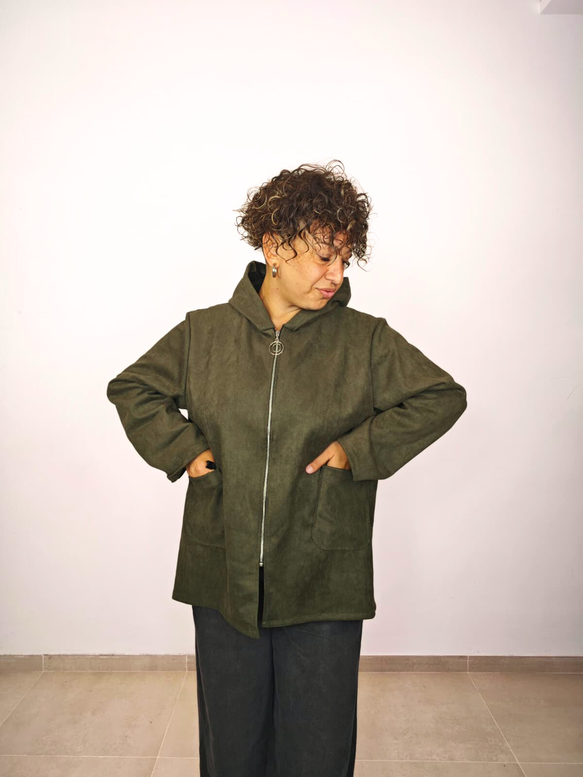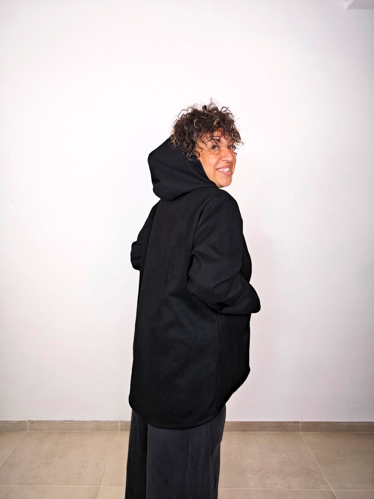 Tessuto scamosciato, zip e tasche parte frontale, corta avanti più lunga dietro - cappuccio