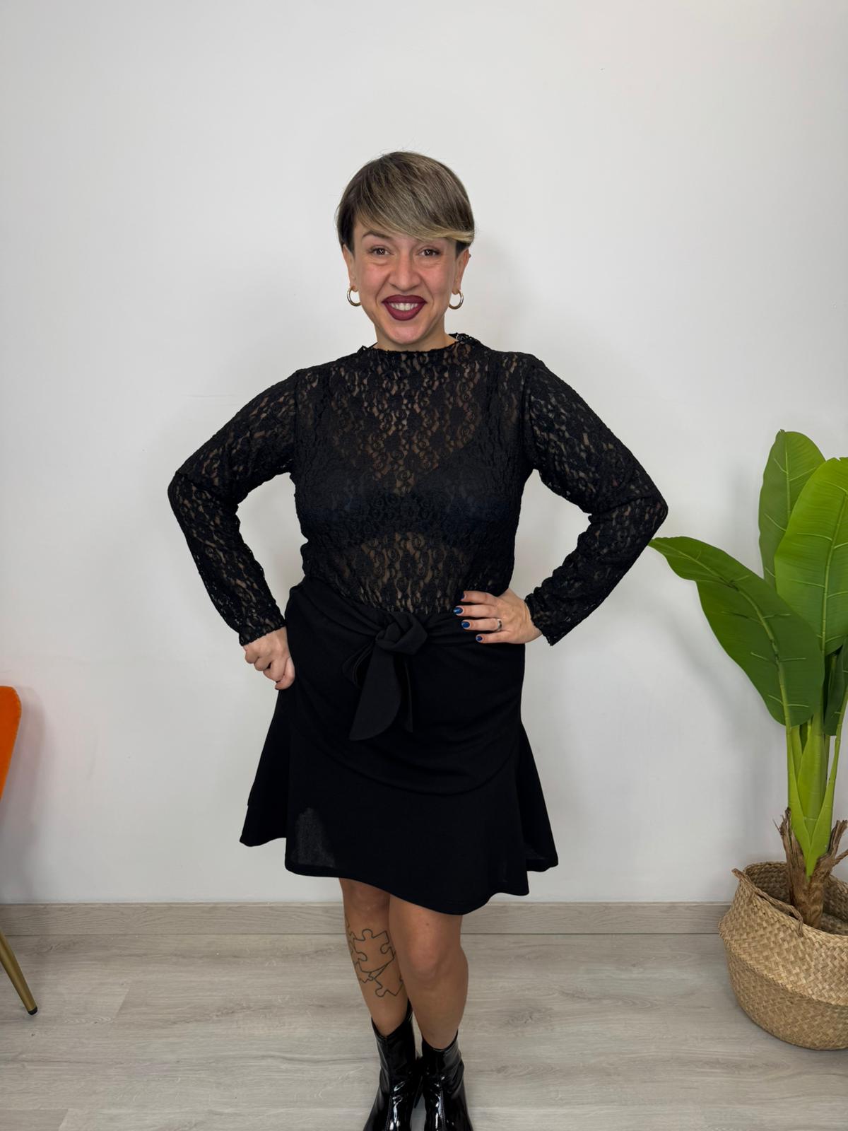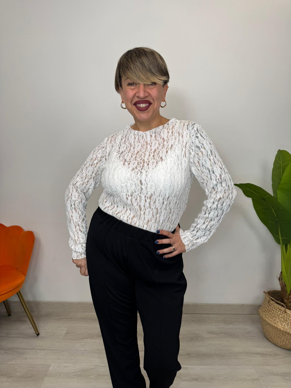MAGLIA CASSANDRA taglia unica con vestibilità dalla 48 alla 54, tessuto elasticizzato con lieve trasparenza ricamato.