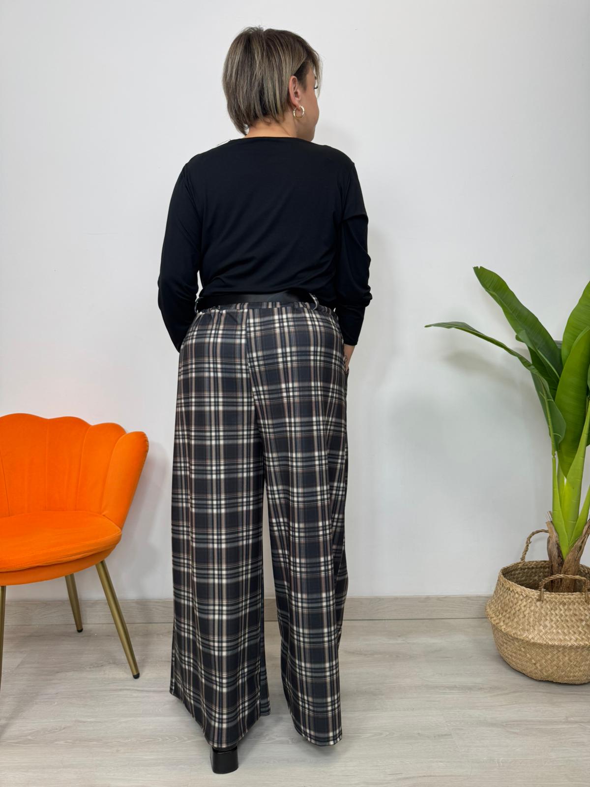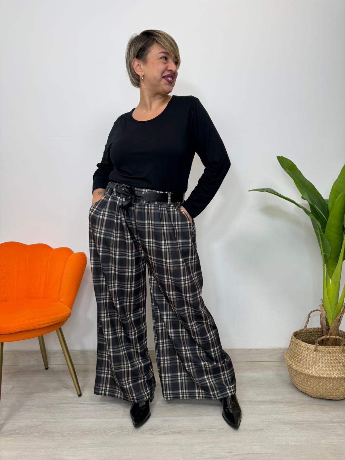 Pantaloni palazzo in tartan che abbracciano le curve con stile audace. Taglia unica elasticizzata per una vestibilità perfetta dalla 48 alla 54, con elastico in vita che garantisce comfort senza compromessi. La trama tartan aggiunge carattere e movimento, mentre le tasche laterali pratiche completano il design. Un capo che non scende a compromessi: indossalo con sicurezza e fai girare le teste.
