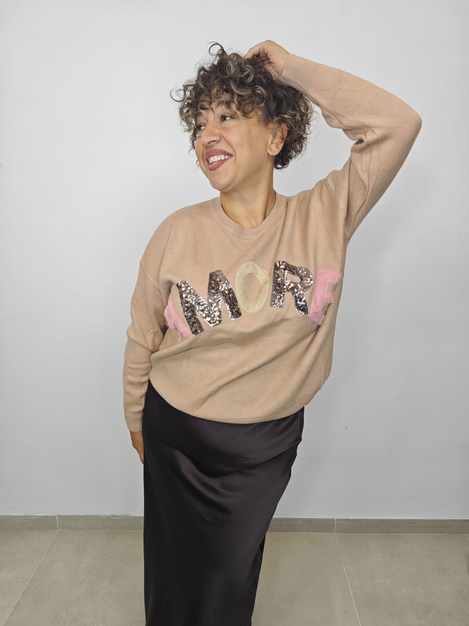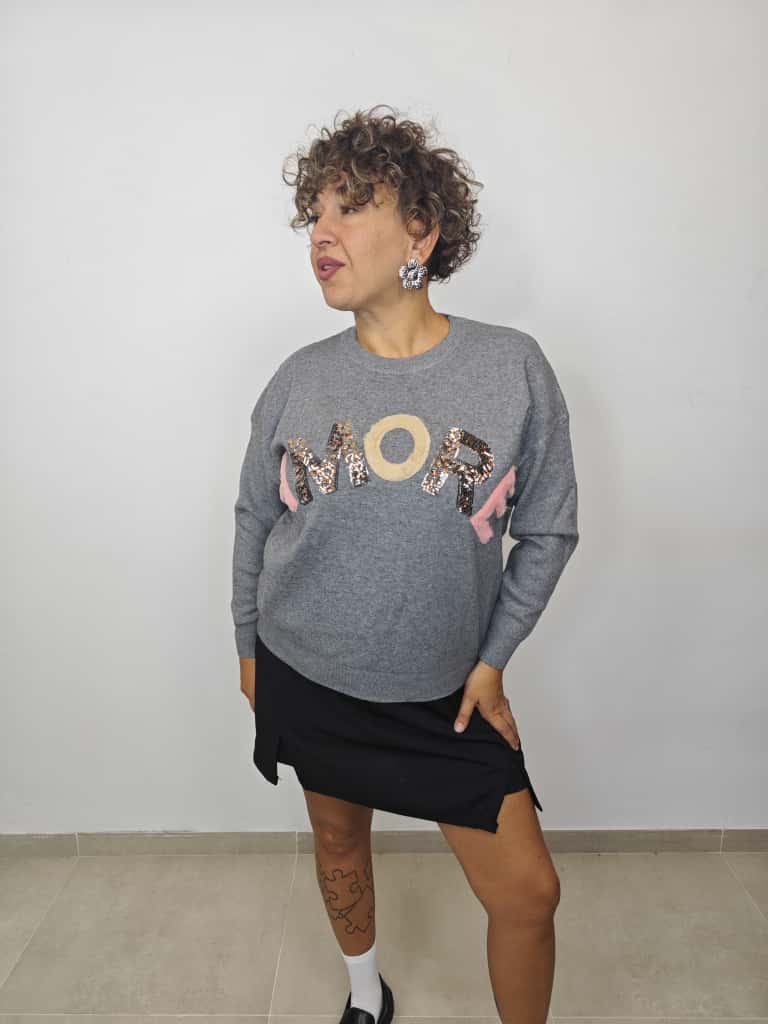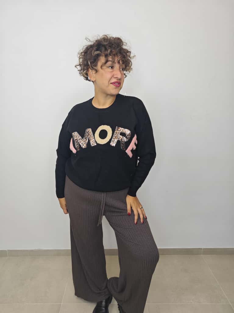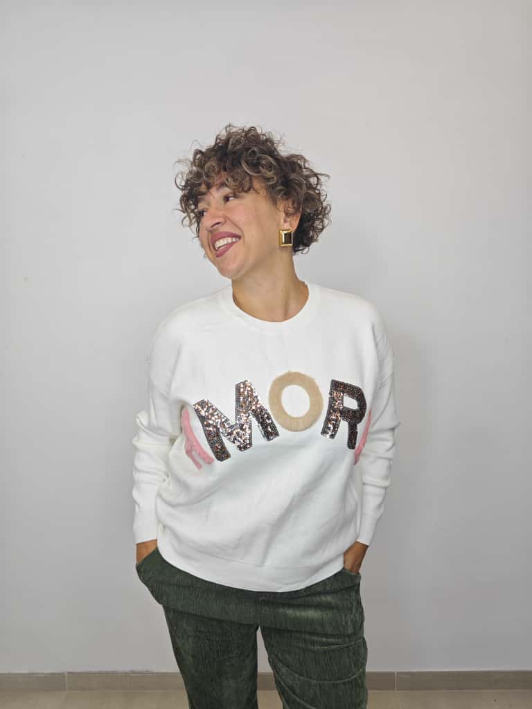 Il maglione "Amore" veste con audacia dalla taglia 48 alla 54, grazie al suo fit unico e comodo. Il girocollo classico valorizza la scritta mix di pelosetta e paillettes, che dona un tocco glamour e originale. Polsini e vita elasticizzati assicurano una vestibilità aderente che esalta la silhouette. Realizzato con una miscela di materiali pregiati (40% poliammide, 20% viscosa, 20% modal, 10% poliestere, 10% elastan), garantisce comfort e stile in ogni occasione.