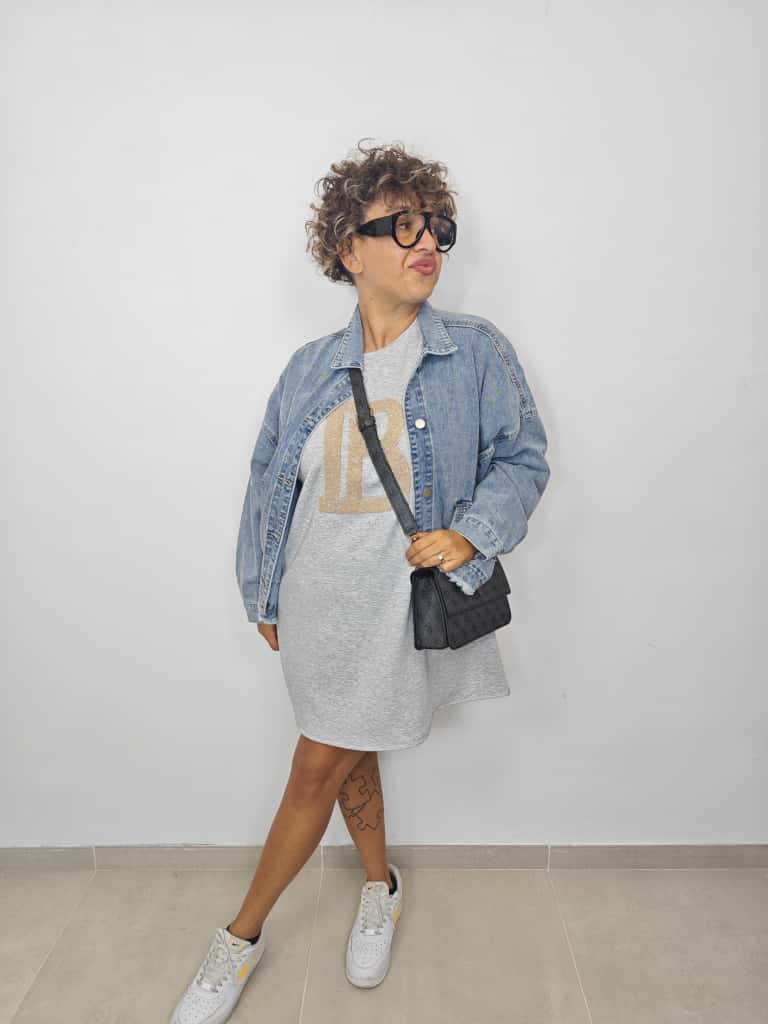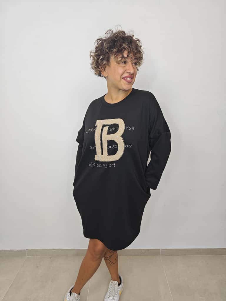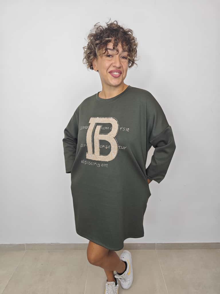 Scopri la maxi felpa abito "B", taglia unica perfetta per chi veste dalla 48 alla 54. Con un comodo girocollo e un tessuto non felpato, è ideale anche come vestito per un look casual e versatile. Realizzata in morbida miscela di cotone, viscosa e spandex, garantisce comfort e una vestibilità che segue le curve con un tocco di elasticità. Semplice, pratico e divertente da indossare ogni giorno!