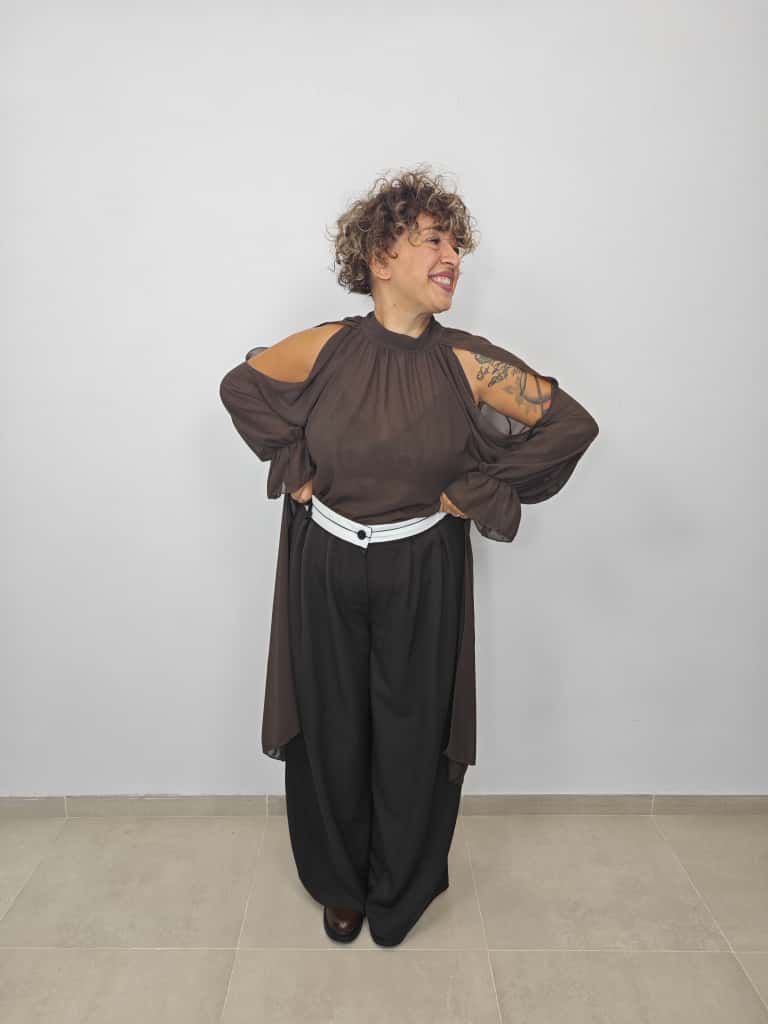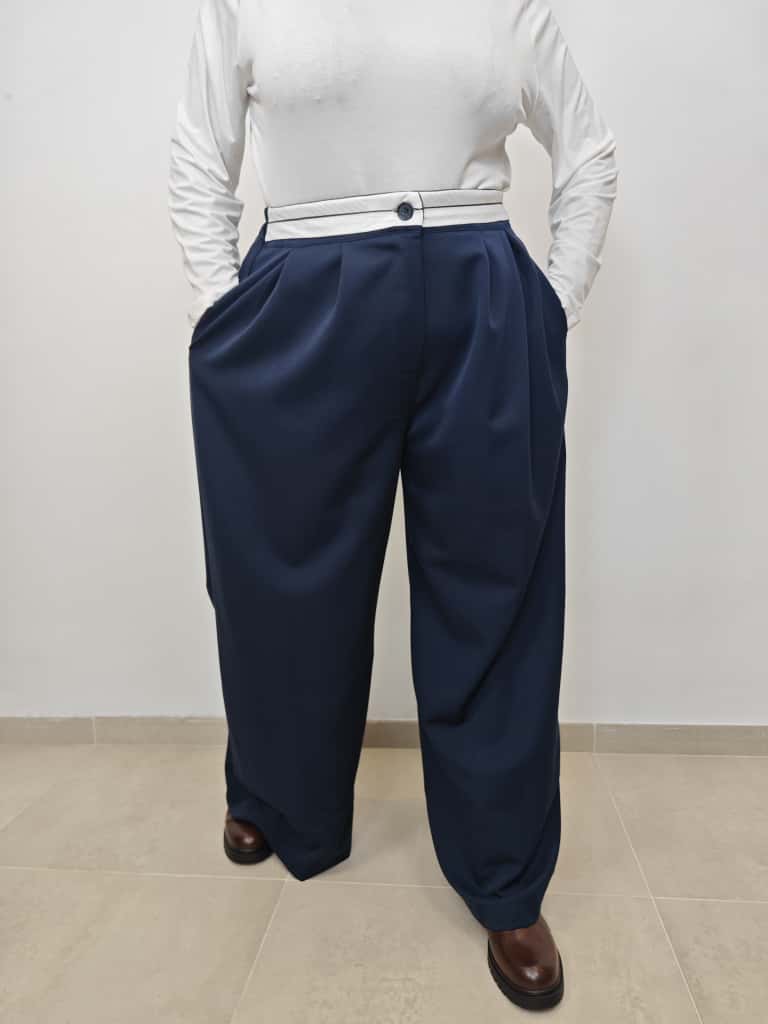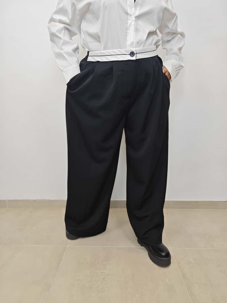 Pantalone in tessuto tailleur, chiusura con zip e bottone, tasche laterali, elastico sul retro, fit a palazzo.